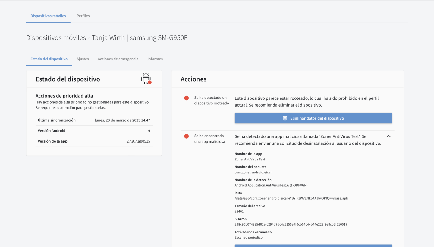Controle la seguridad de sus dispositivos móviles en el panel central.